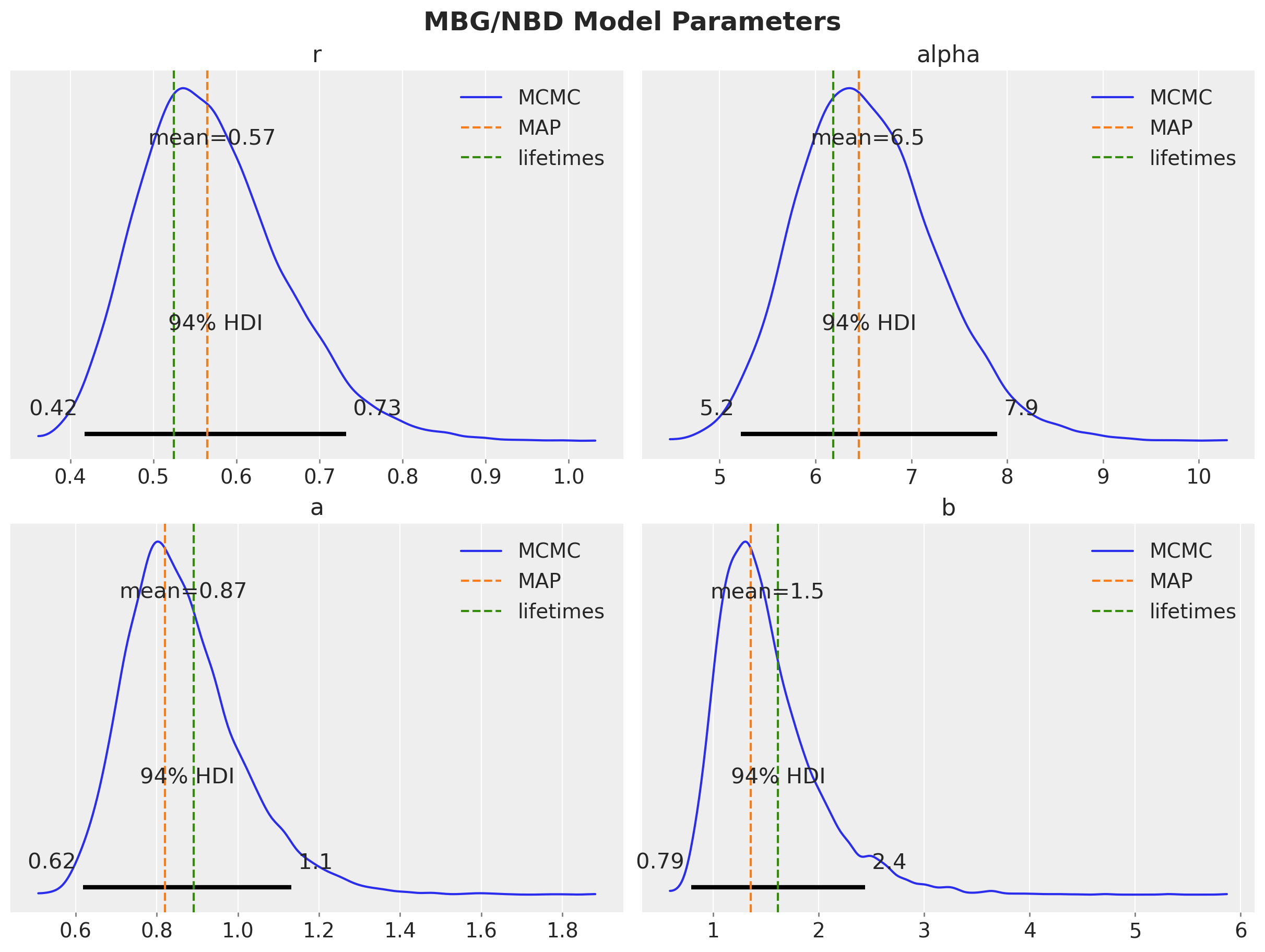 The r and alpha purchase rate parameters are quite similar for all three models, but the a and b dropout parameters are better approximated with the default parameters when fitted with MCMC.