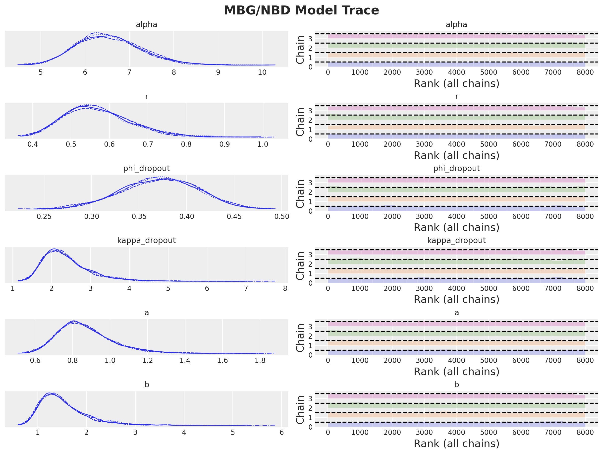 plt.gcf().suptitle("MBG/NBD Model Parameters", fontsize=18, fontweight="bold");