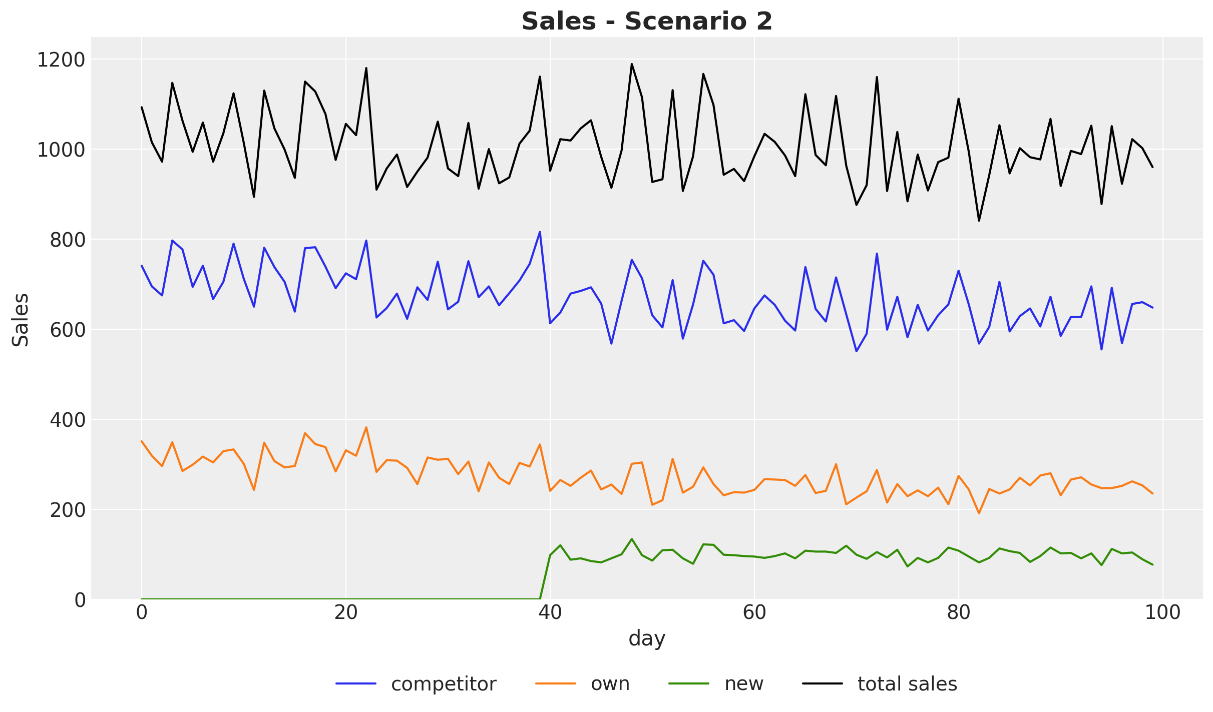 As always, we must visualise the data! We can see noisy but broadly flat sales of your own and all competitor products. Then you launch a new product which sells quite well. Visually we get a sense that the sales of your own and competitor sales drop, but can we put numbers on how incremental or cannabalistic the new product is? That will be the goal of our analysis.