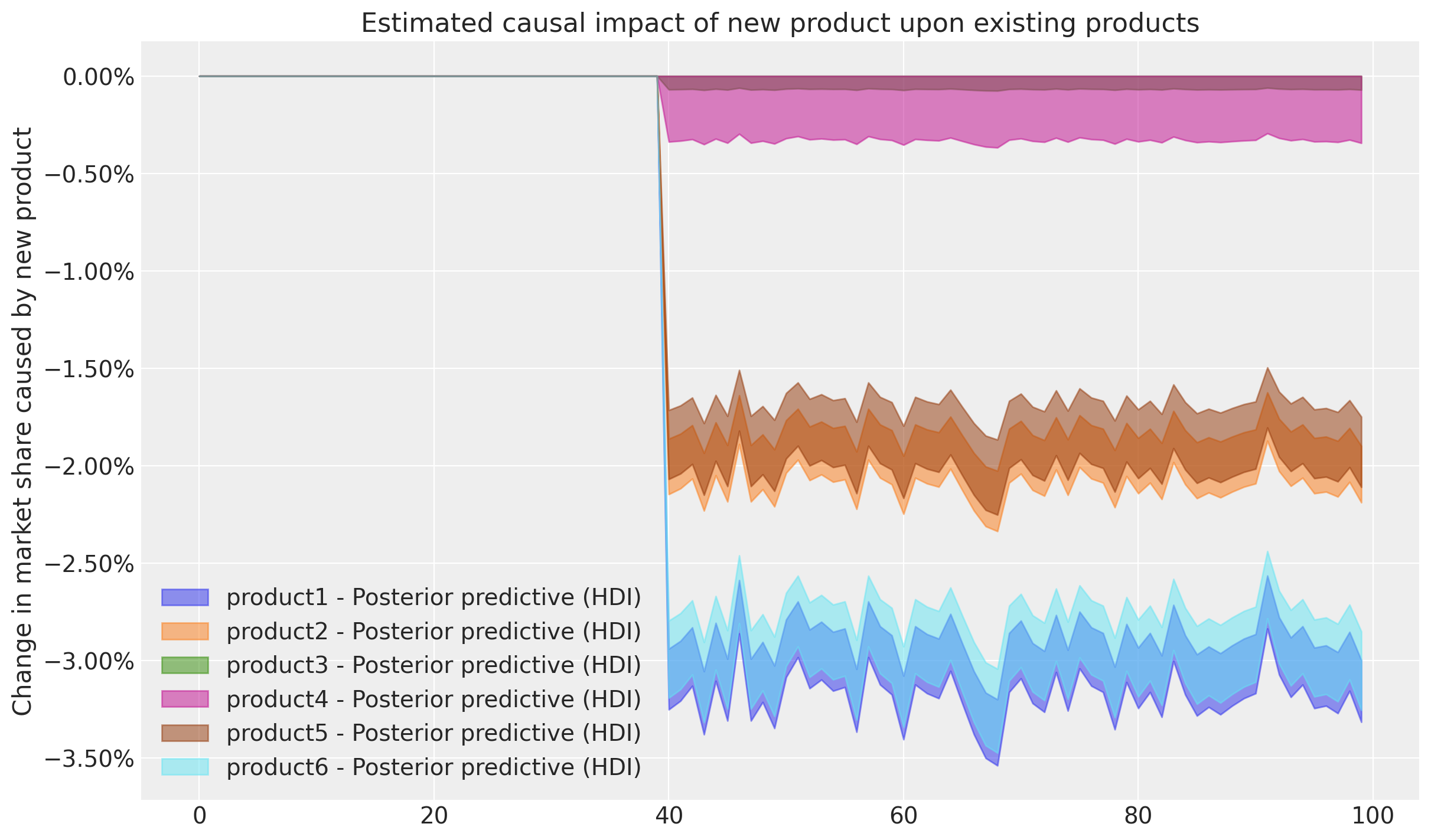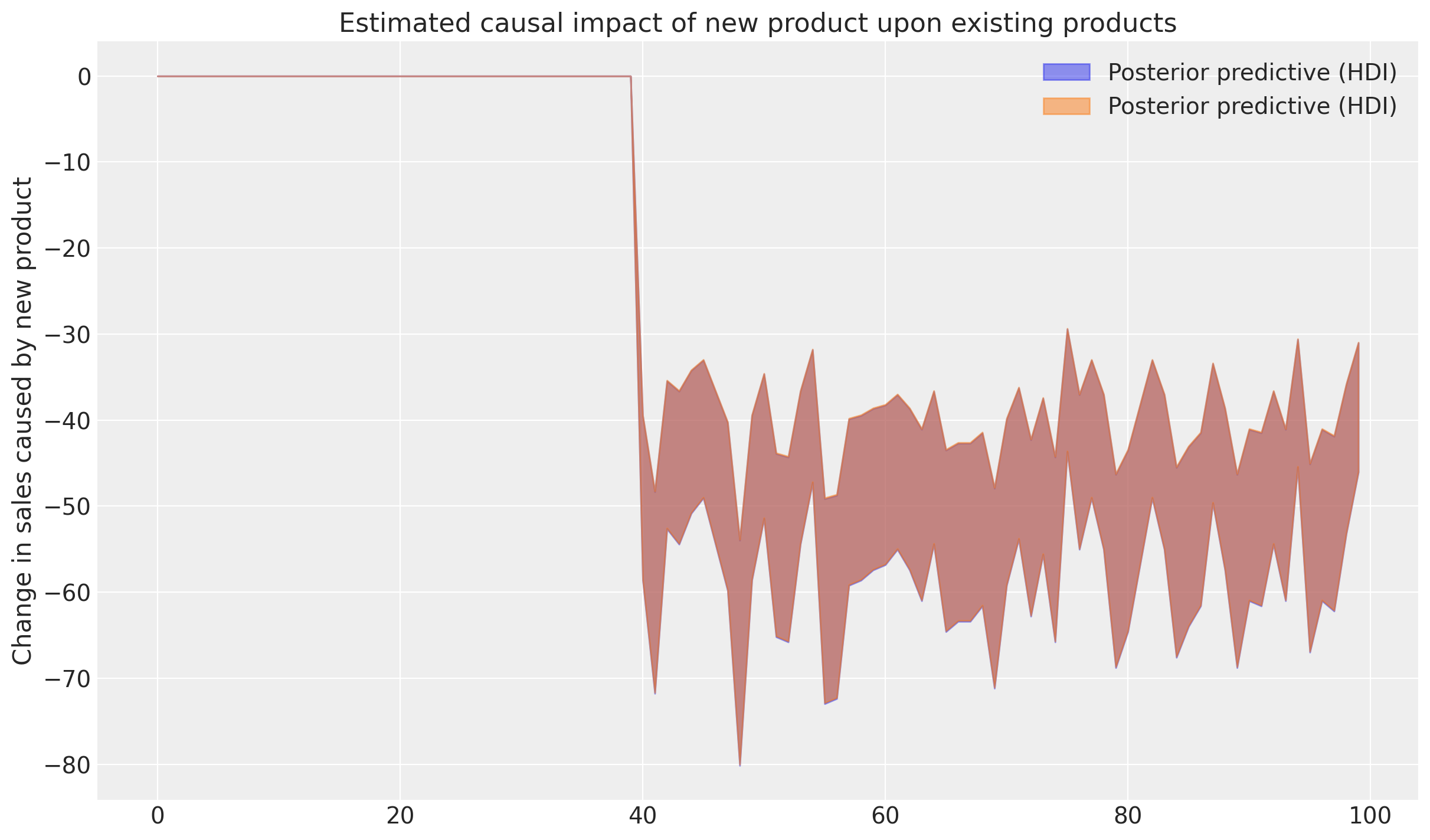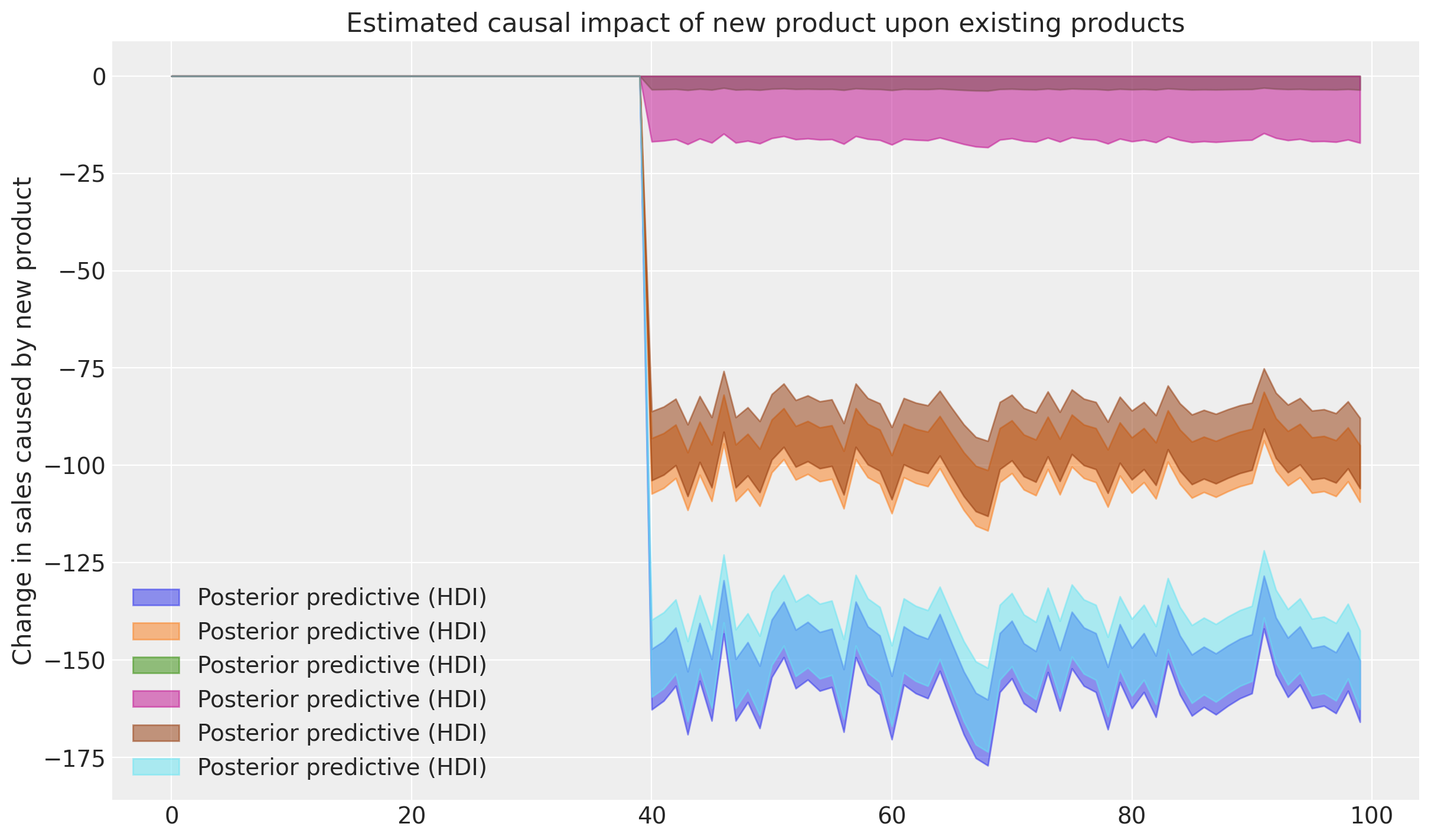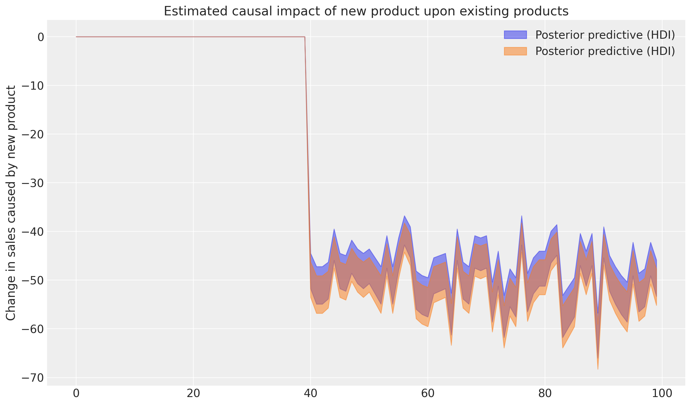So how does the model do? Plotting the causal impact of the new product upon the sales of the existing products looks reasonable. This is primarily because the changes in sales caused by the new product are roughly equally split between the competitor and own sales, and this is how we set up the simulated data. However, compared to the first example we can see a much greater level of uncertainty in the causal impacts of the new product.