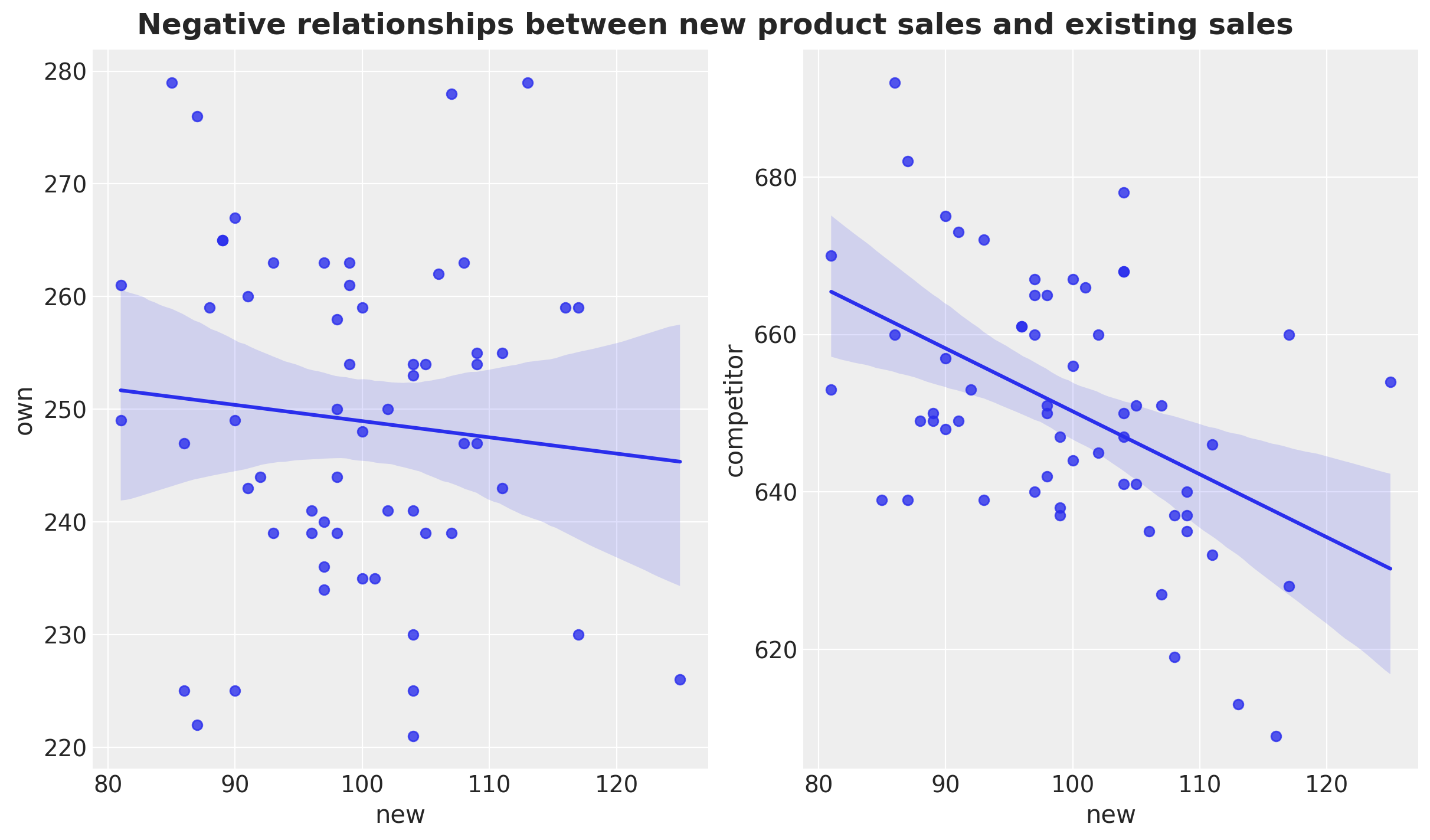 Let’s take a look at the relationships between the new product sales and the own and competitor sales. In comparison to the first scenario, we now see positive correlations. This might be a bit of a warning sign because it runs counter to the assumption of the model - when new sales are higher the own and competitor sales are lower.