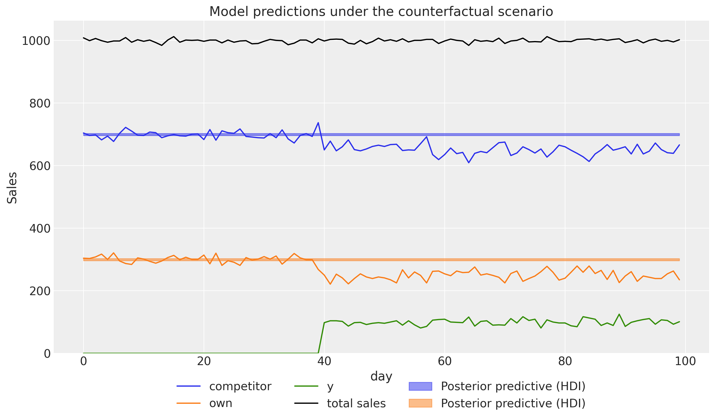 Now let’s look at the model’s predicted sales in the counterfactual scenario where the company did not launch the new product. We can evaluate this visually to see if the counterfactual scenario makes sense. In this ultra-simplified example it is easy to evaluate this as a “yes”. The model predicts what we would intuitively expect, that the own and competitor sales would have continued as they were prior to the new product launch.