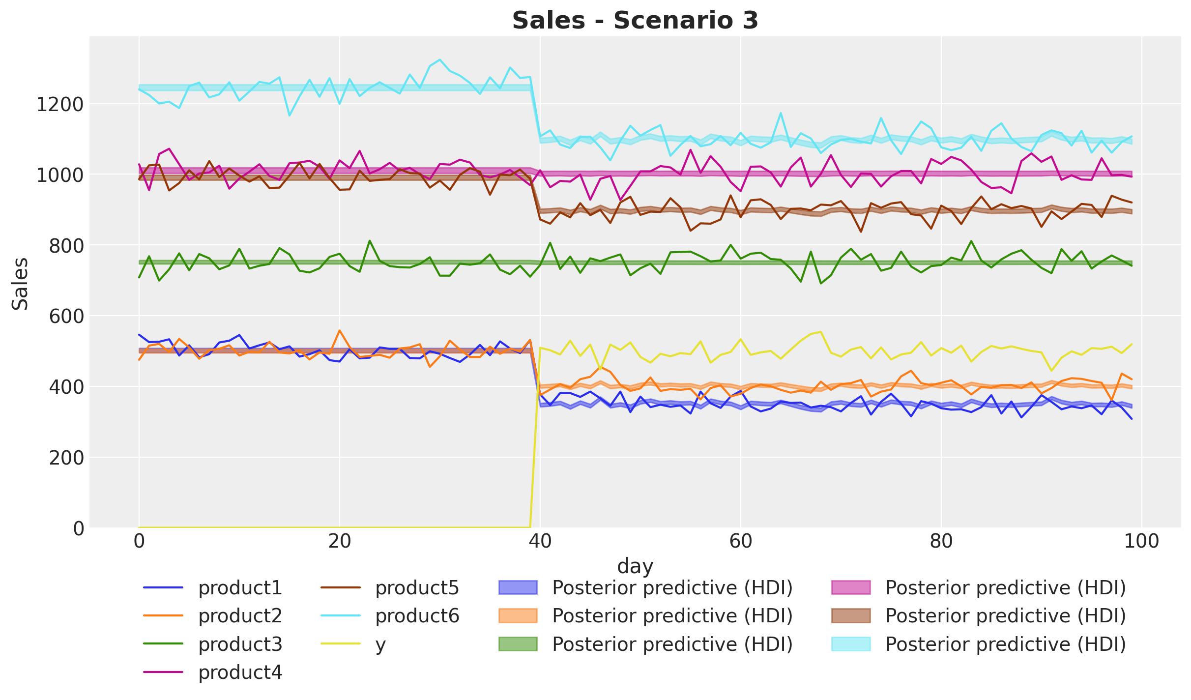 Let’s (visually) evaluate to what extent the model can account for the sales data by plotting posterior predictive fits. The plot below looks pretty good - we can see that the model predictions (shaded regions) capture the main properties of the actual sales data, namely the step change at the time of the new product introduction.