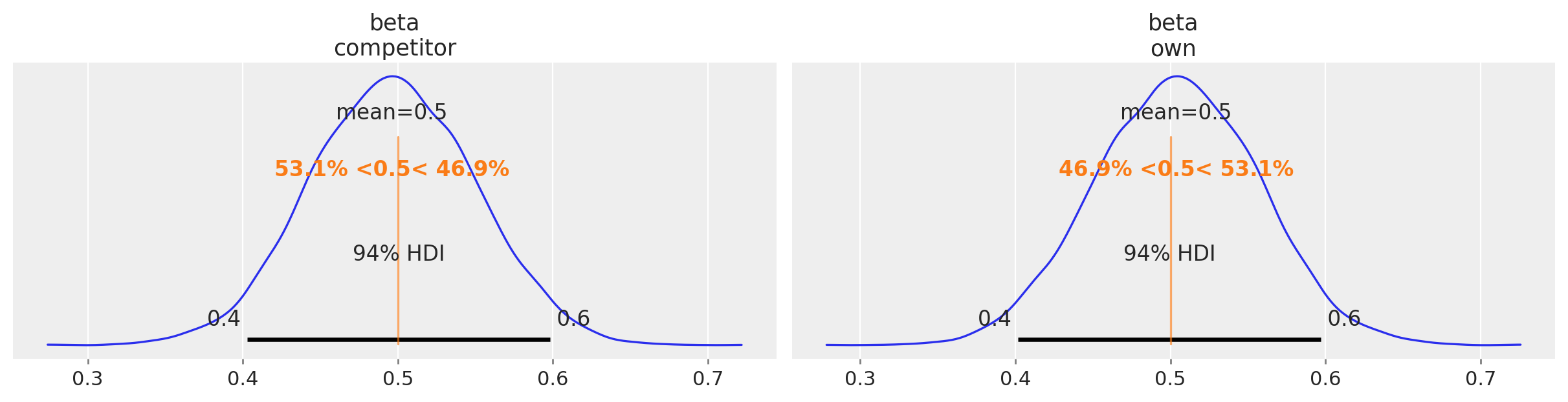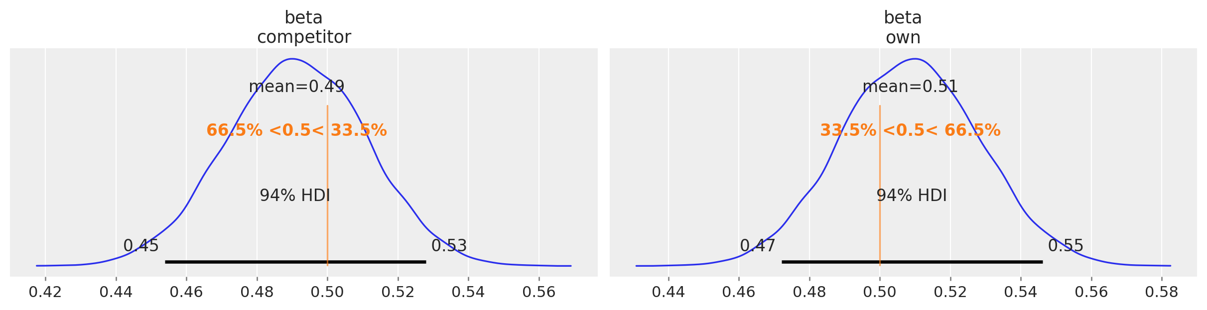 We can see that the 94% credible intervals are relatively tight and are roughly centered on 50/50. So practically we may conclude that we have approximately 50% incrementality, 50% cannibalization.