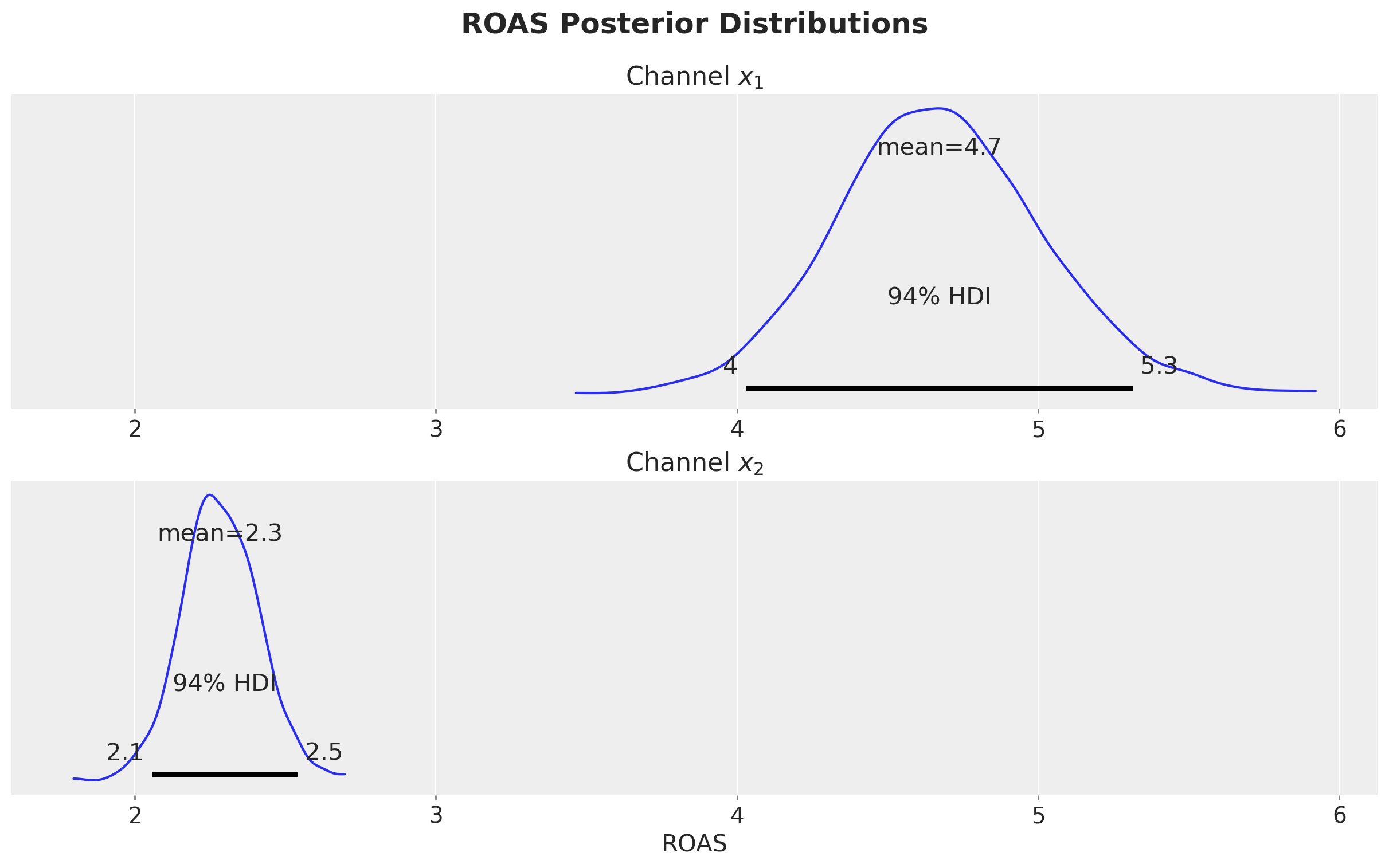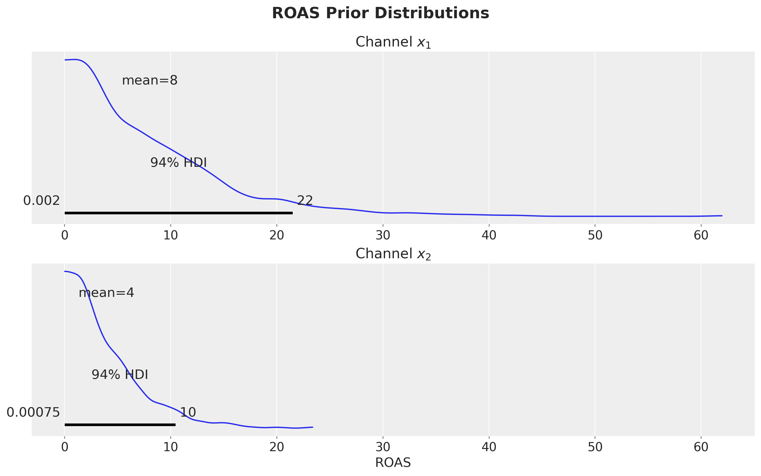 As expected, the ROAS are positive! Moreover, for our particular case, the set of plausible values are very reasonable (as we own the simulation 😉). We can not stress enough how important this step is! If the expected ROAS are not reasonable, before seeing the data it is most likely that the model will not fit the data well. Also, conceptually the model would be very flawed. So if you take anything from this notebook, please always do prior predictive checks on the quantities you want to infer 🙂.