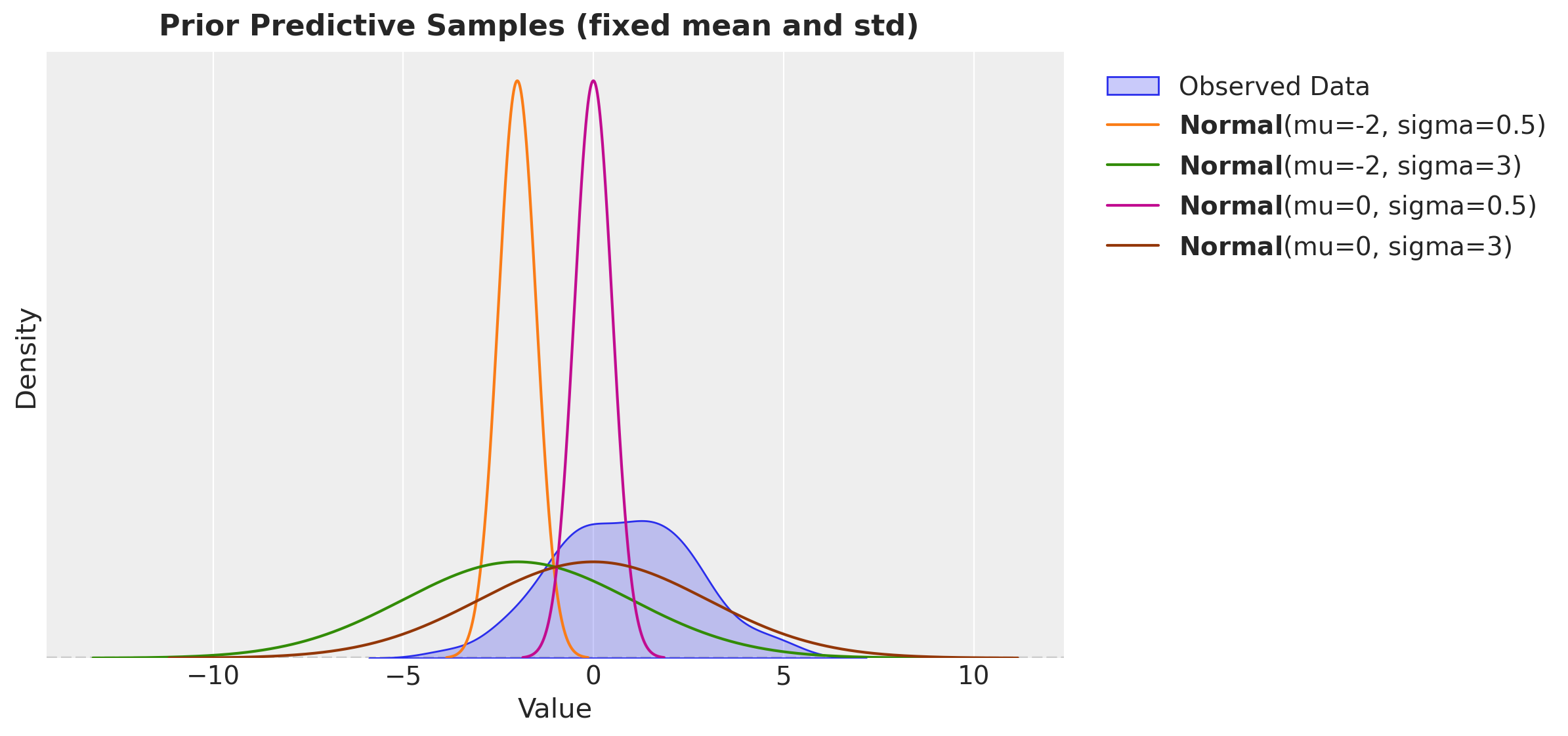 The prior predictive distribution \(p(y)\) represents our beliefs about the data before we observe it. Mathematically, it’s the distribution of the data marginalized over the prior: