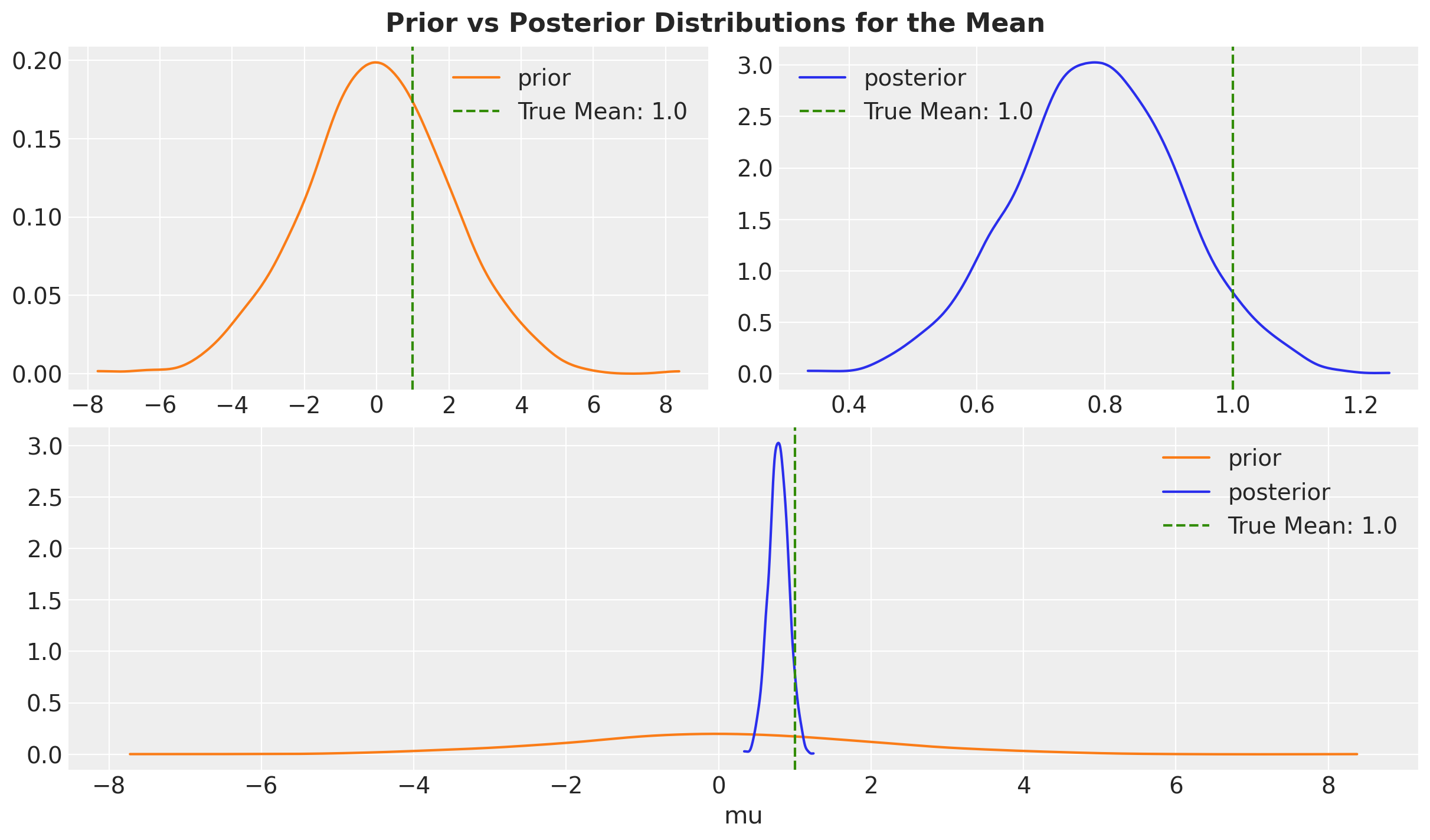 We clearly see how the data has shrunk the prior distribution to have a finer posterior estimate.