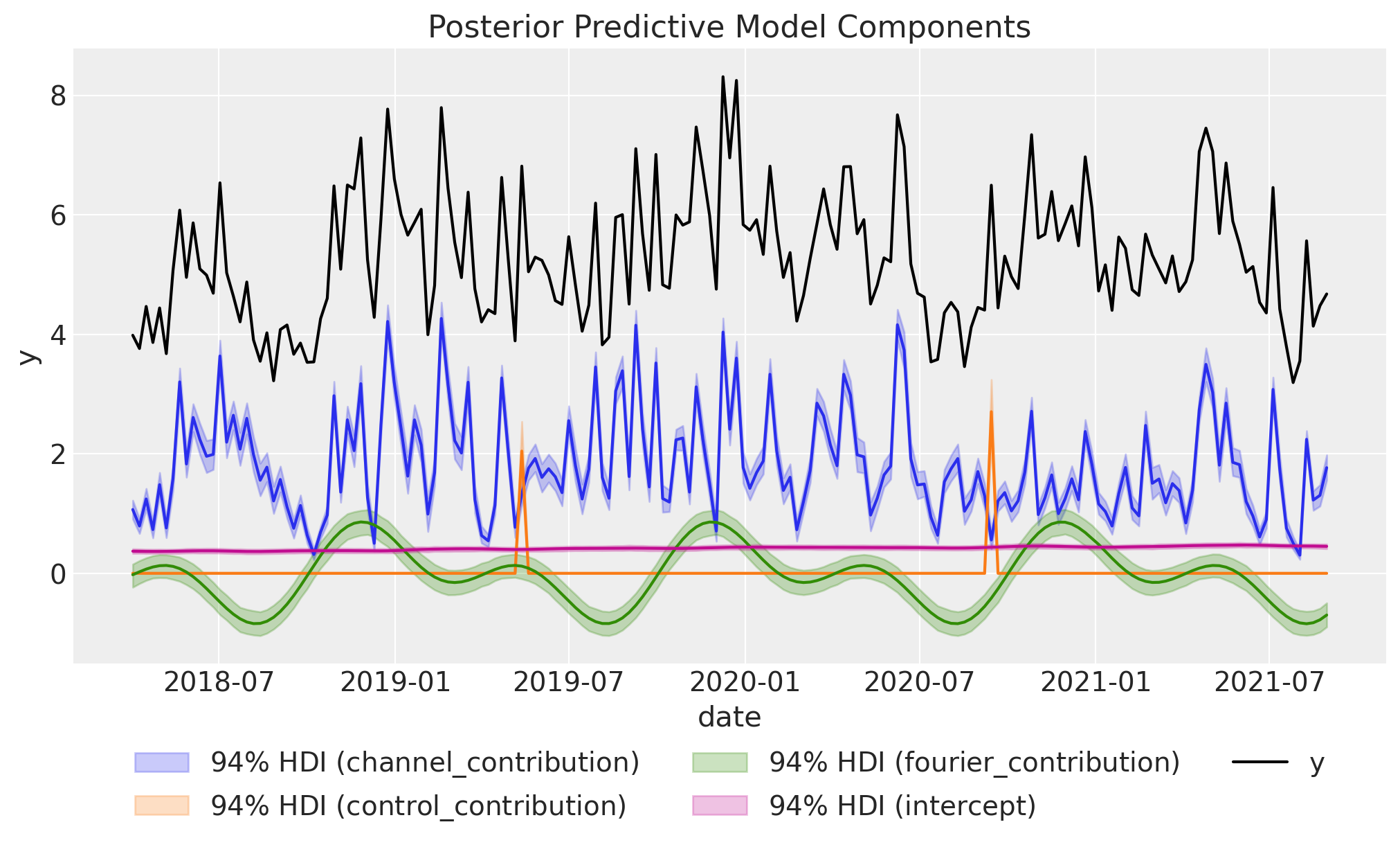 NUTS: [intercept_baseline, intercept_temporal_latent_multiplier_raw_eta, intercept_temporal_latent_multiplier_raw_ls, intercept_temporal_latent_multiplier_raw_hsgp_coefs_offset, adstock_alpha, saturation_lam, saturation_beta, gamma_control, gamma_fourier, y_sigma]