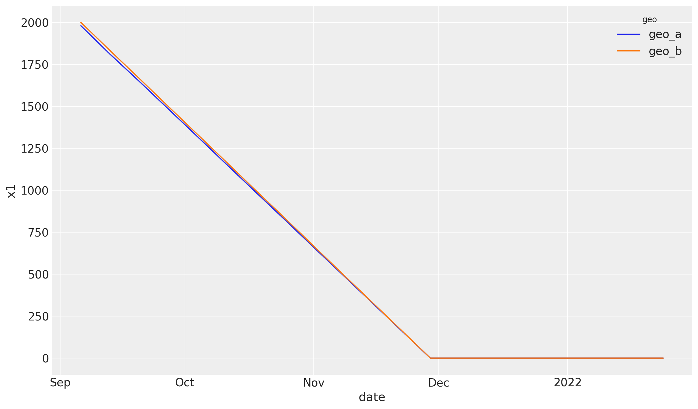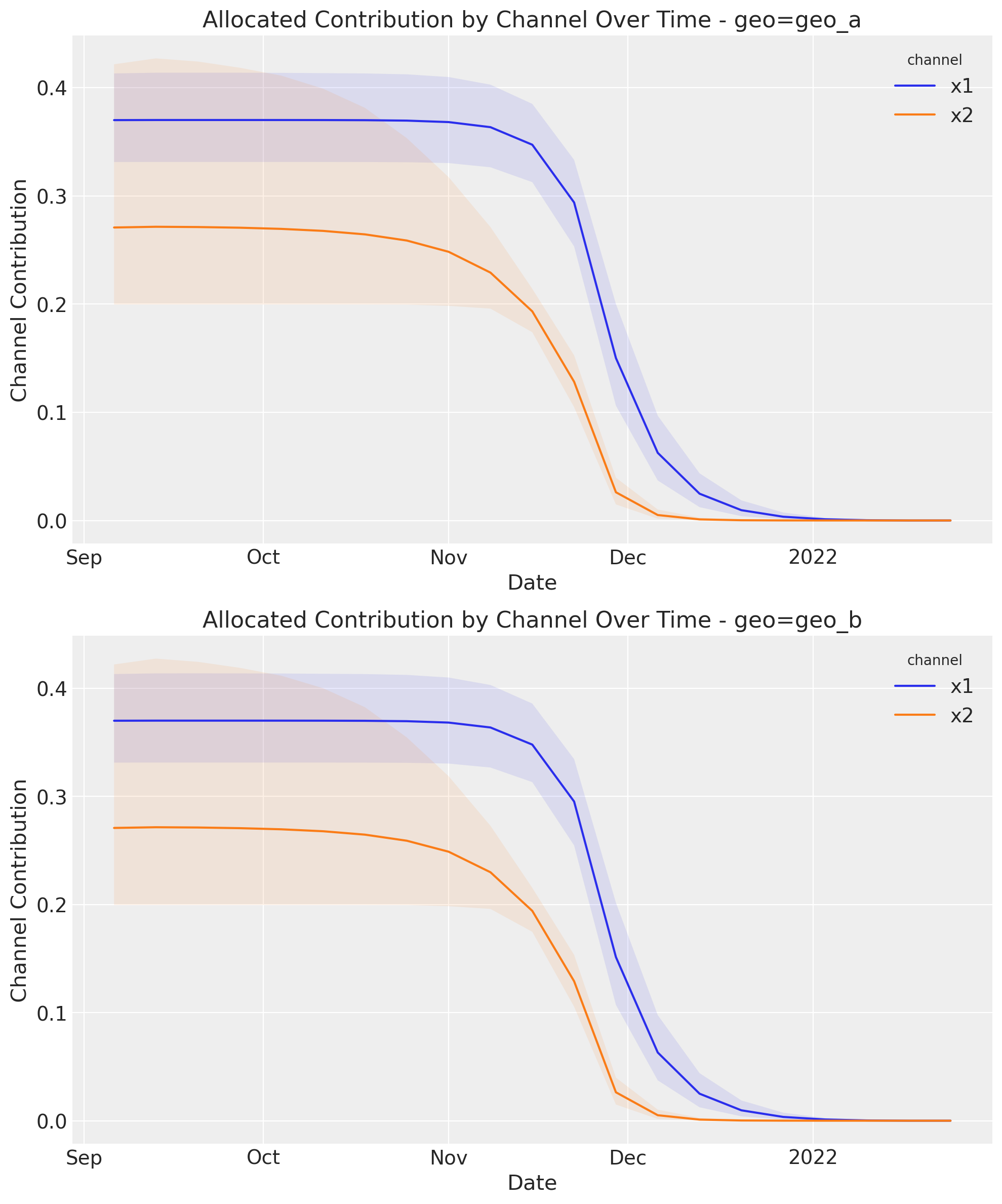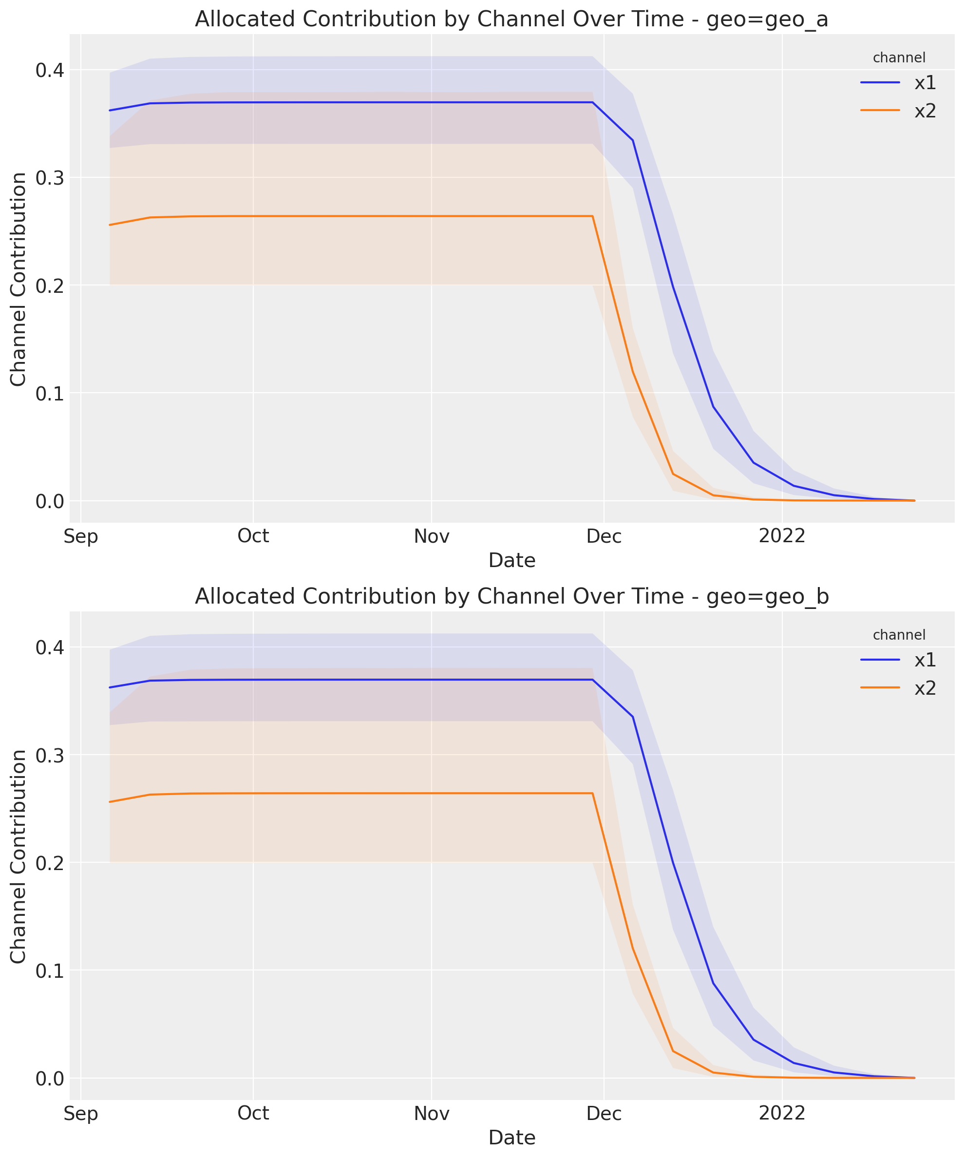 Note: When using a custom budget distribution over time, ensure that the values for each channel and geo sum to 1 across the time dimension. This is demonstrated in the example above where we create decreasing values that are normalized to sum to 1.