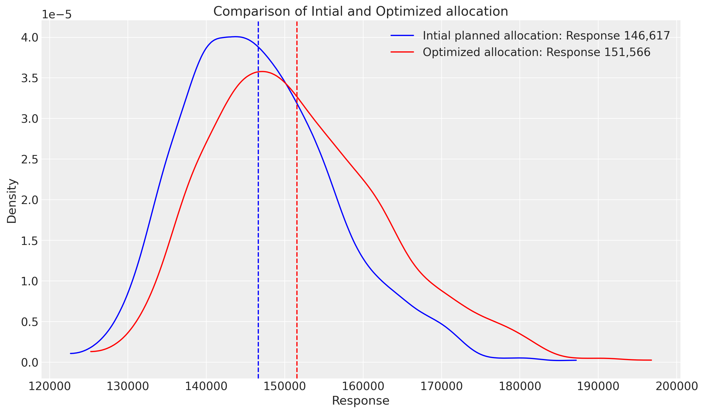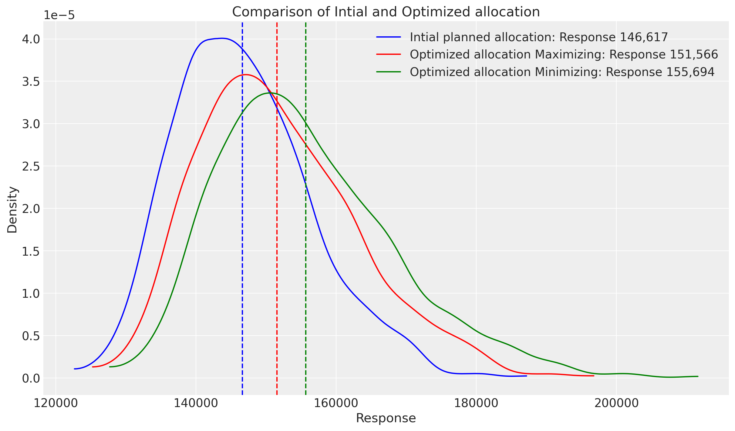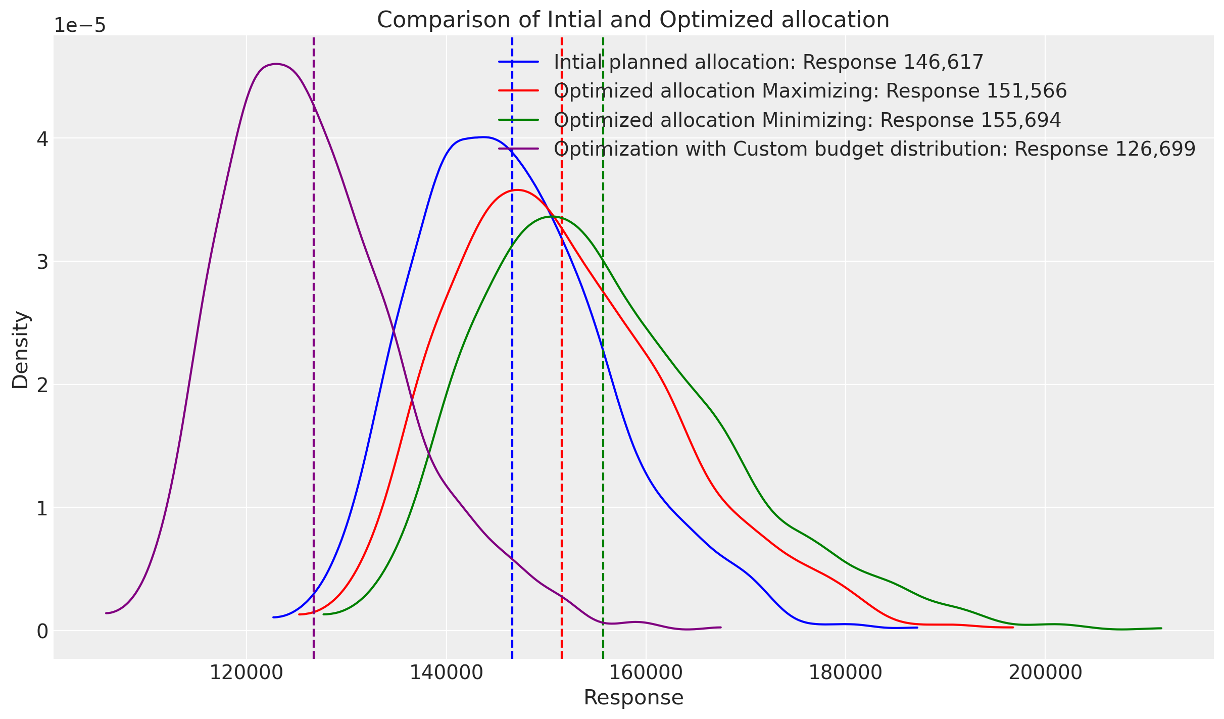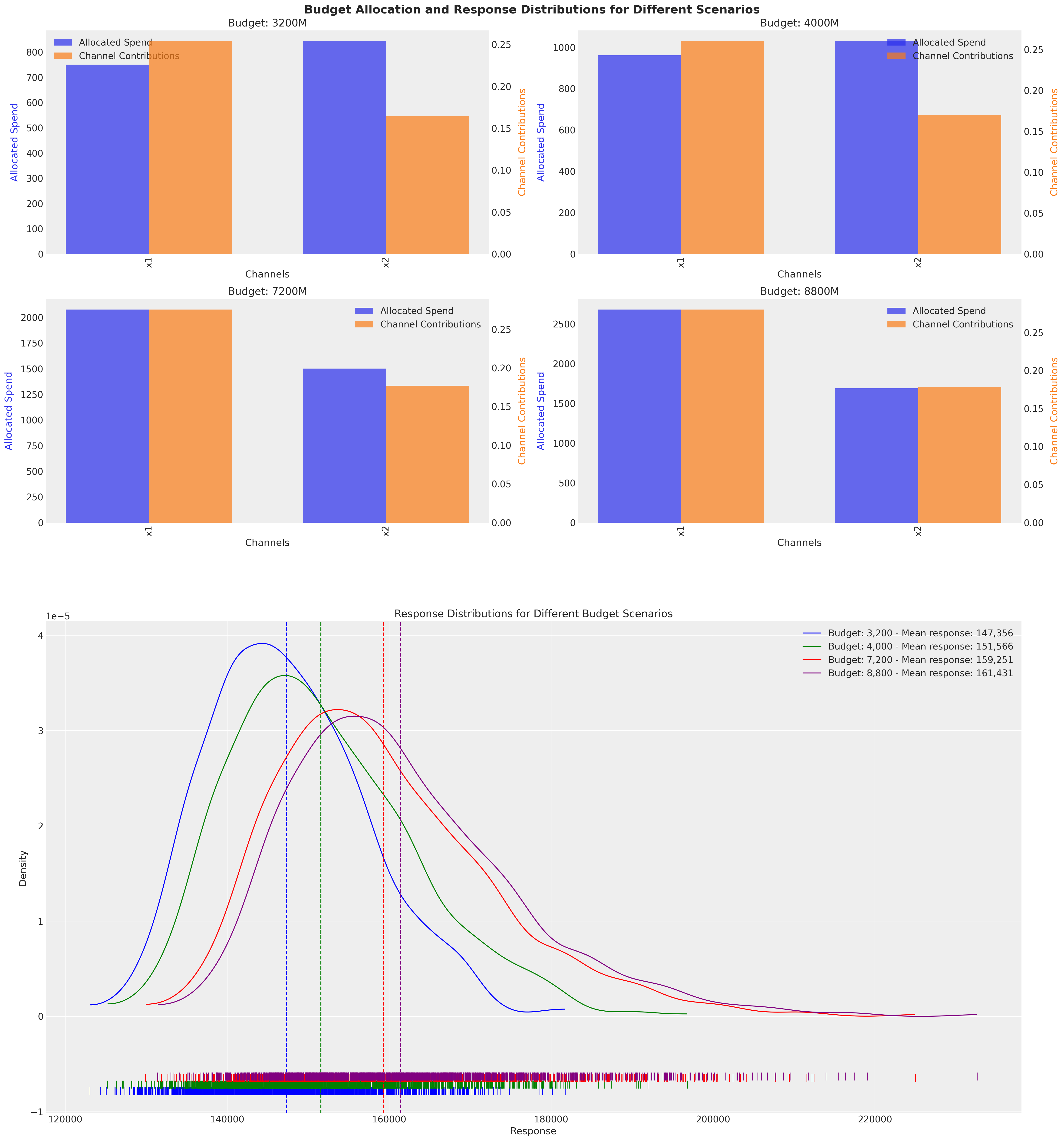 label=f"Optimization with Custom budget distribution: Response {optimized_mean_custom_budget_distribution:,.0f}",