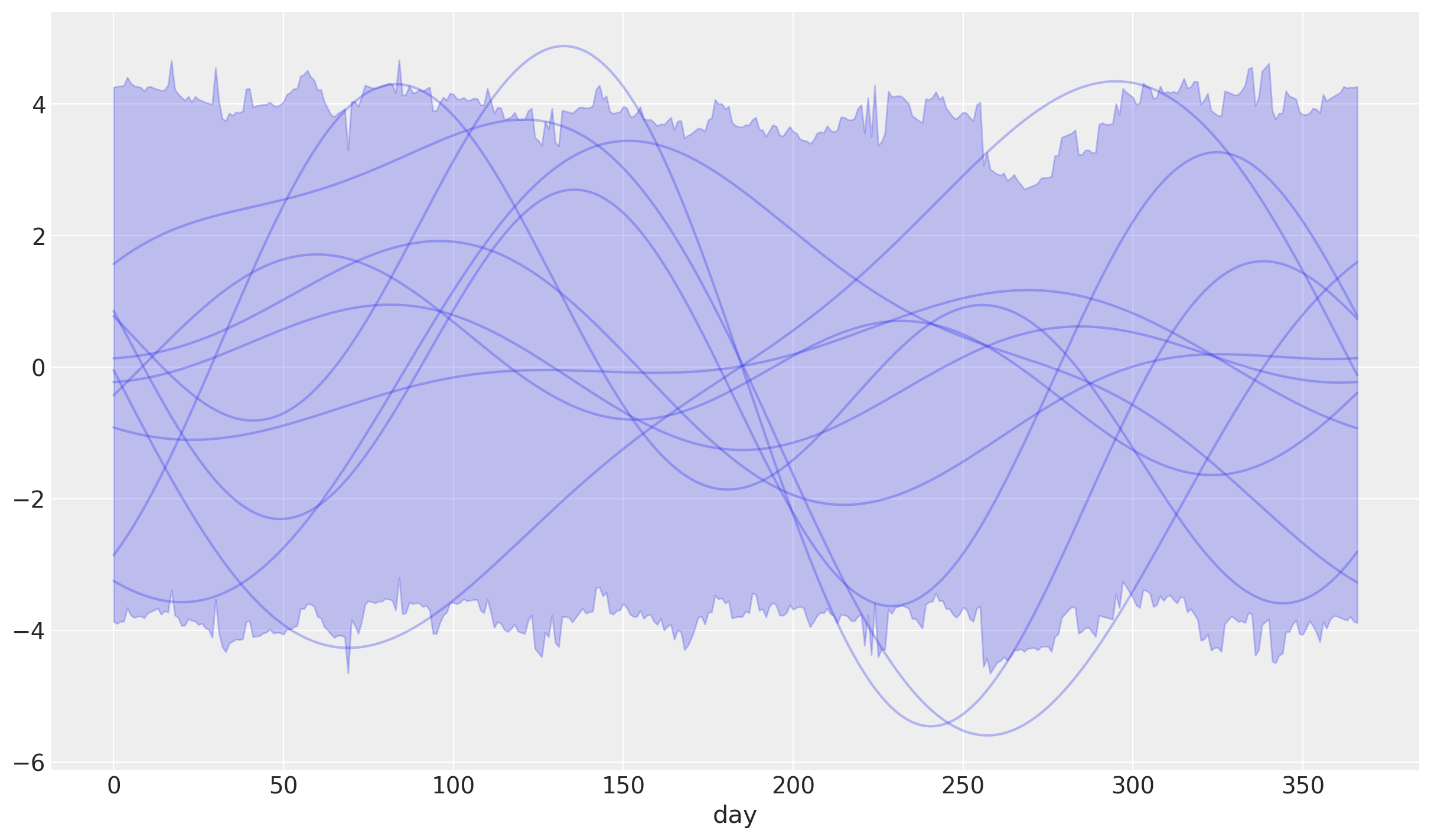 The previous workflow can be used to understand our priors still. Just pass the coords to the sample_prior method in order to add dims to the appropriate variables.