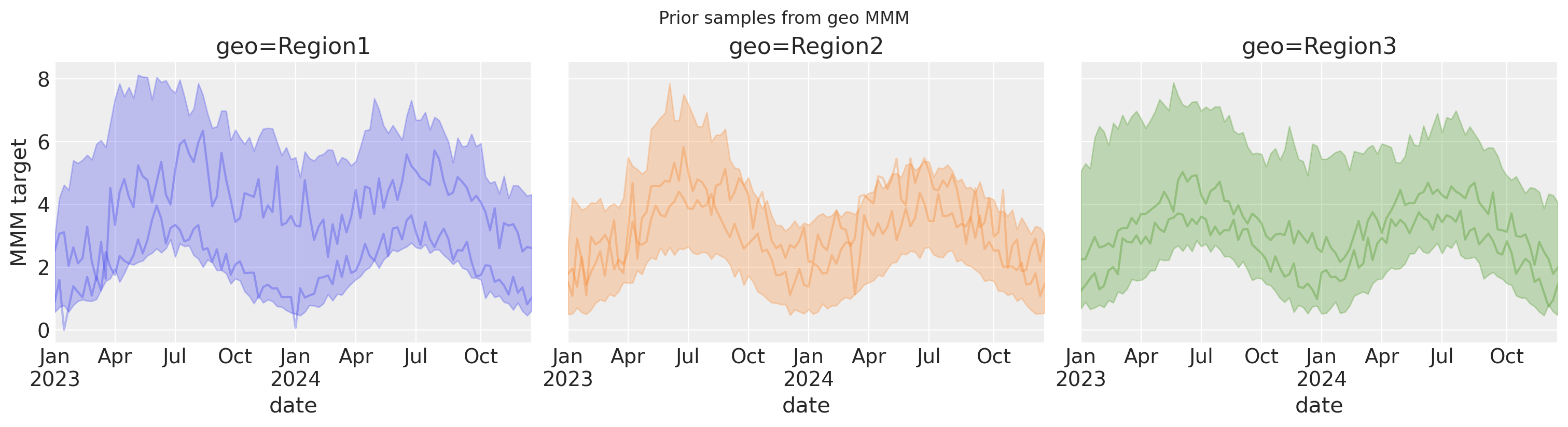 inference_library_version:  5.25.1We will use the plot_curve helper function to plot the target variable across time for each region. This shows the HDI and 2 prior samples for each of the 3 time series.