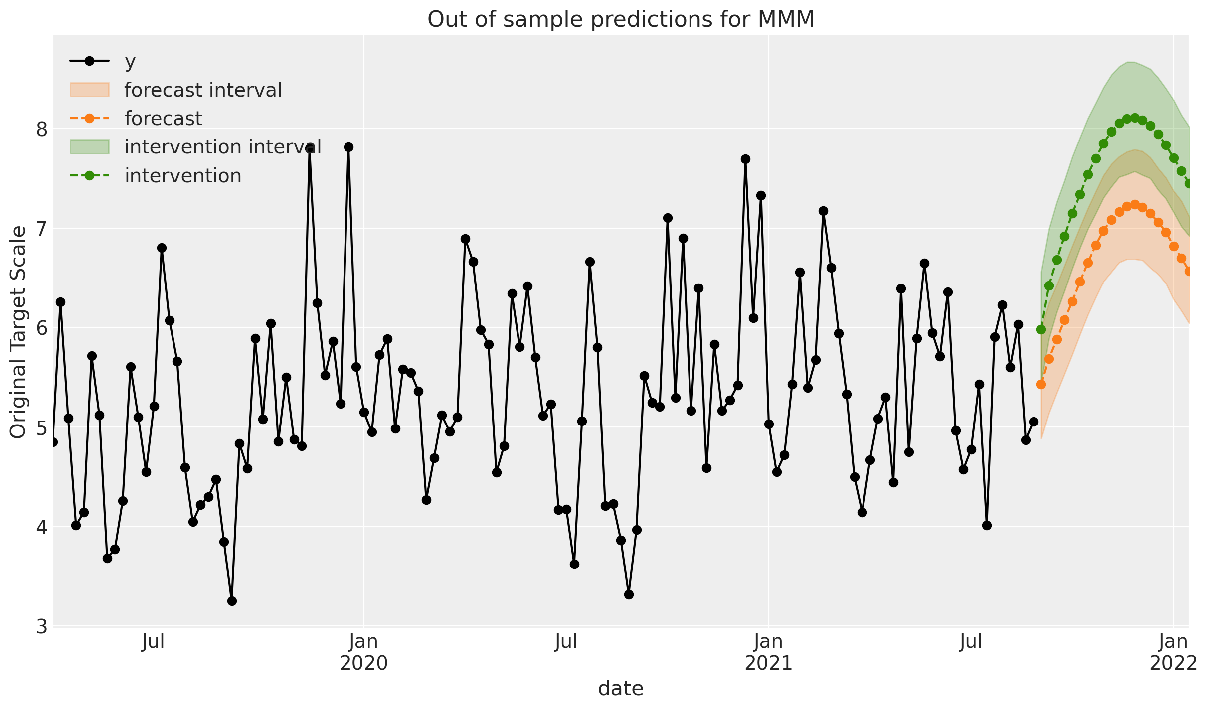 Nice! We can see that, relative to our ‘business as usual` (Step 1 forecast), the MMM predicts that the intervention will lead to an increase in sales. This is a simple example of using an MMM for causal inference - we are predicting the effect of an intervention on future sales.