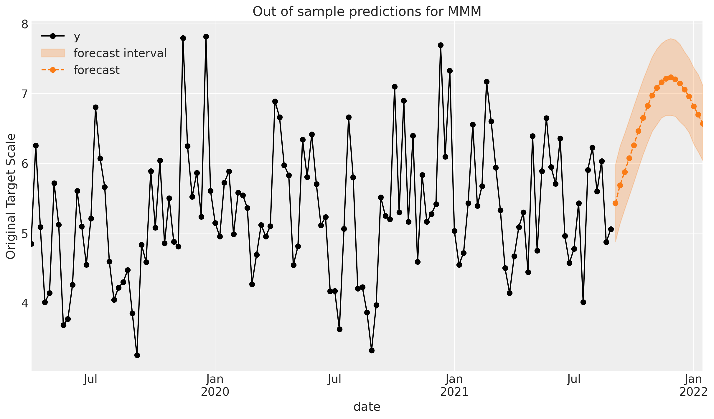 Predicting future sales: A very common use-case of MMM’s is to make forecasts of our outcome variable (e.g. sales). This can be particularly useful ingredient in demand forecasting for example. Once we’ve trained an MMM on historical data we can use the MMM to predict future sales (out of sample prediction) based on past sales, marketing spend, and other predictor variables. This would correspond to step 1 on the causal ladder - we are forecasting into the future but not considering any changes to our marketing strategy. See our docs Budget Allocation with PyMC-Marketing for a worked example.