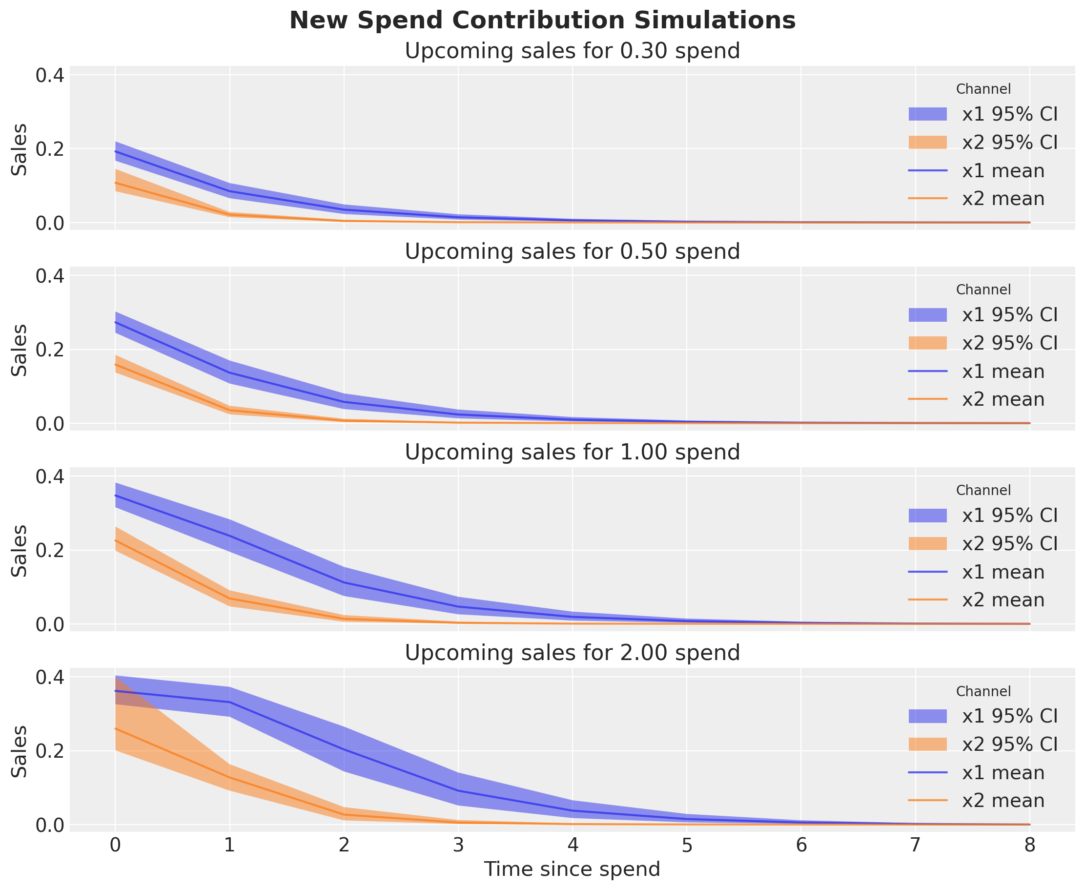 mmm.plot_new_spend_contributions(spend_amount=spend, progressbar=False, ax=ax)