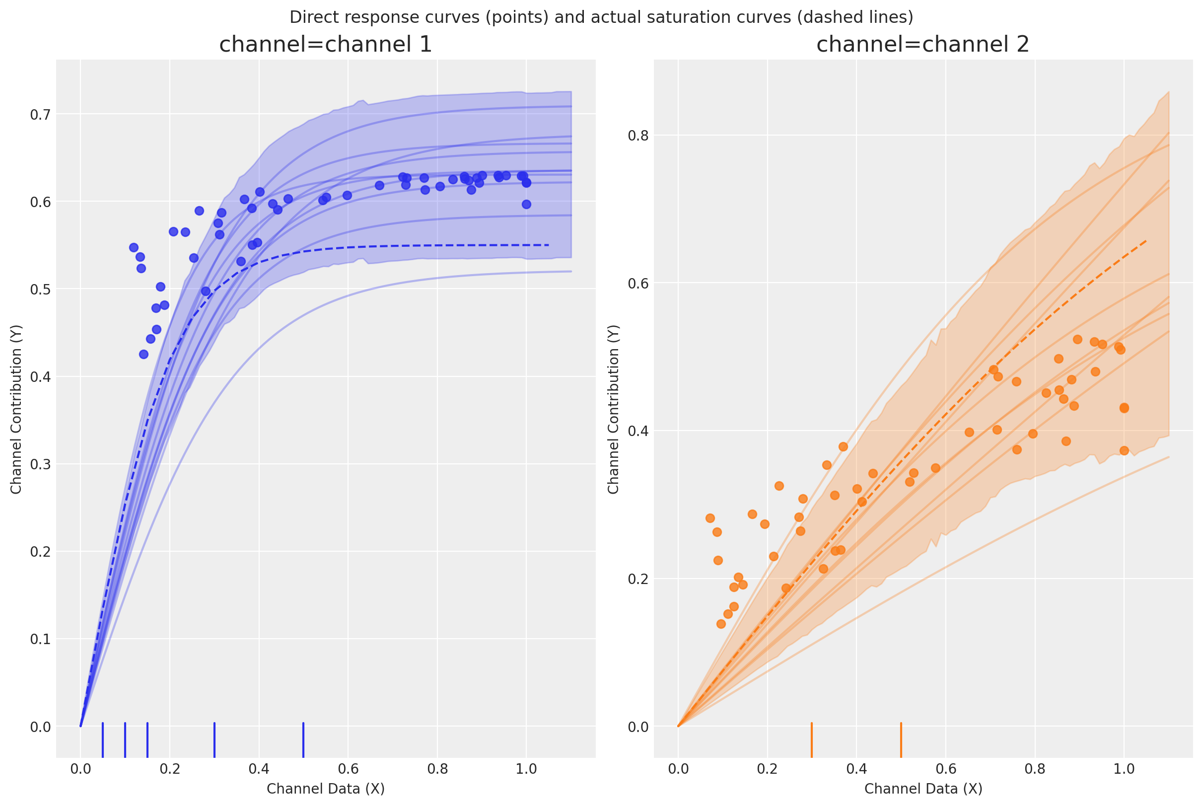 We can show this below by plotting the actual saturation curves (lines) and the direct response curves (points).