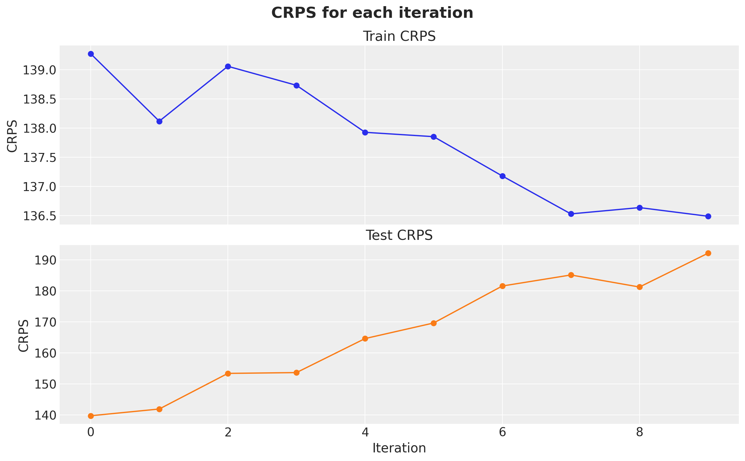 fig.suptitle("CRPS for each iteration", fontsize=18, fontweight="bold", y=1.05);