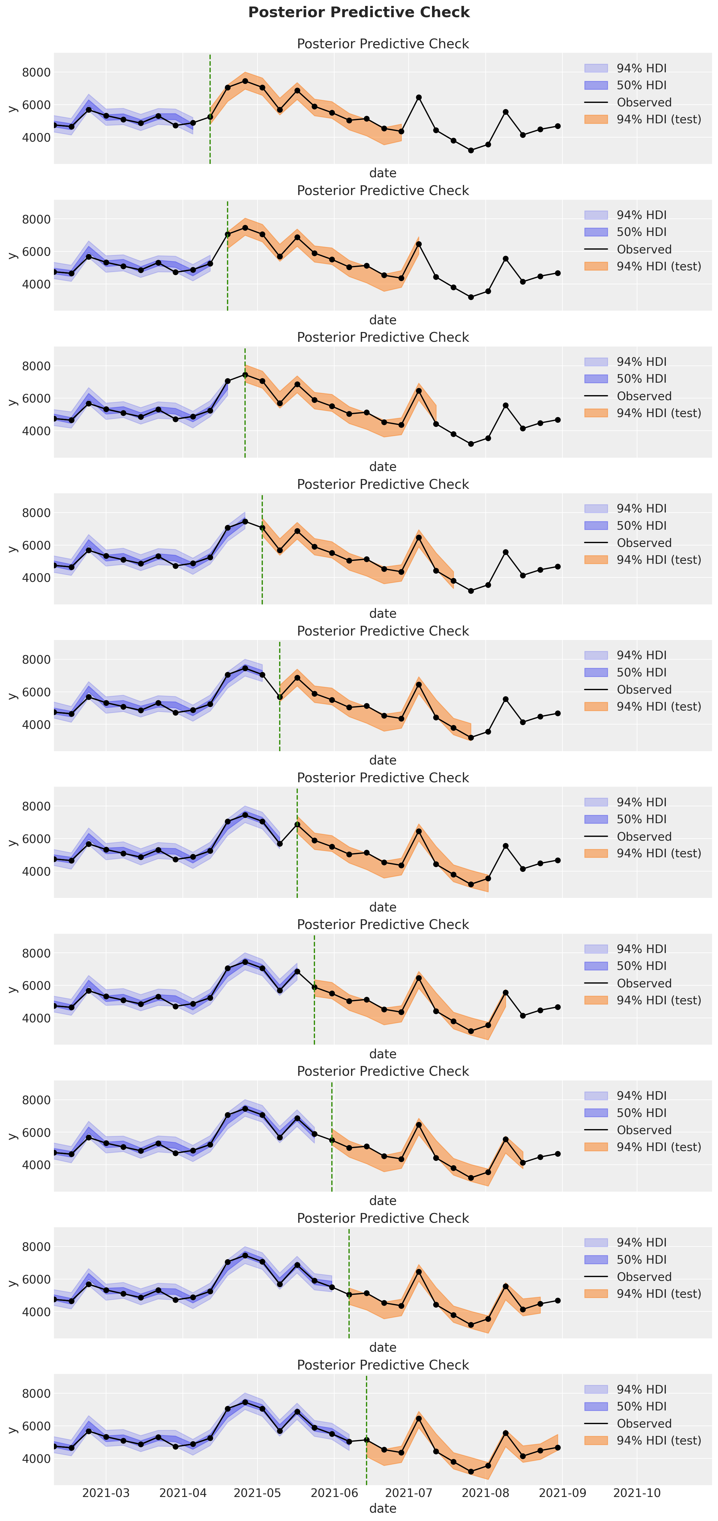 Finally, we evaluate the out of sample predictions. To begin with, we can simply plot the posterior predictive distributions for each iteration for both the training and test data.